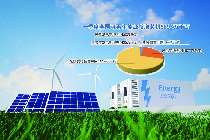 国家能源局新能源司副司长潘慧敏介绍,今年一季度,全国可再生能源新增装机5893万千瓦,占新增装机的70%。其中,水电新增并网142万千瓦,风电新增并网1577万千瓦,光伏发电新增并网4119万千瓦,生物质发电新增并网35万千瓦,光热发电新增并网20万千瓦。